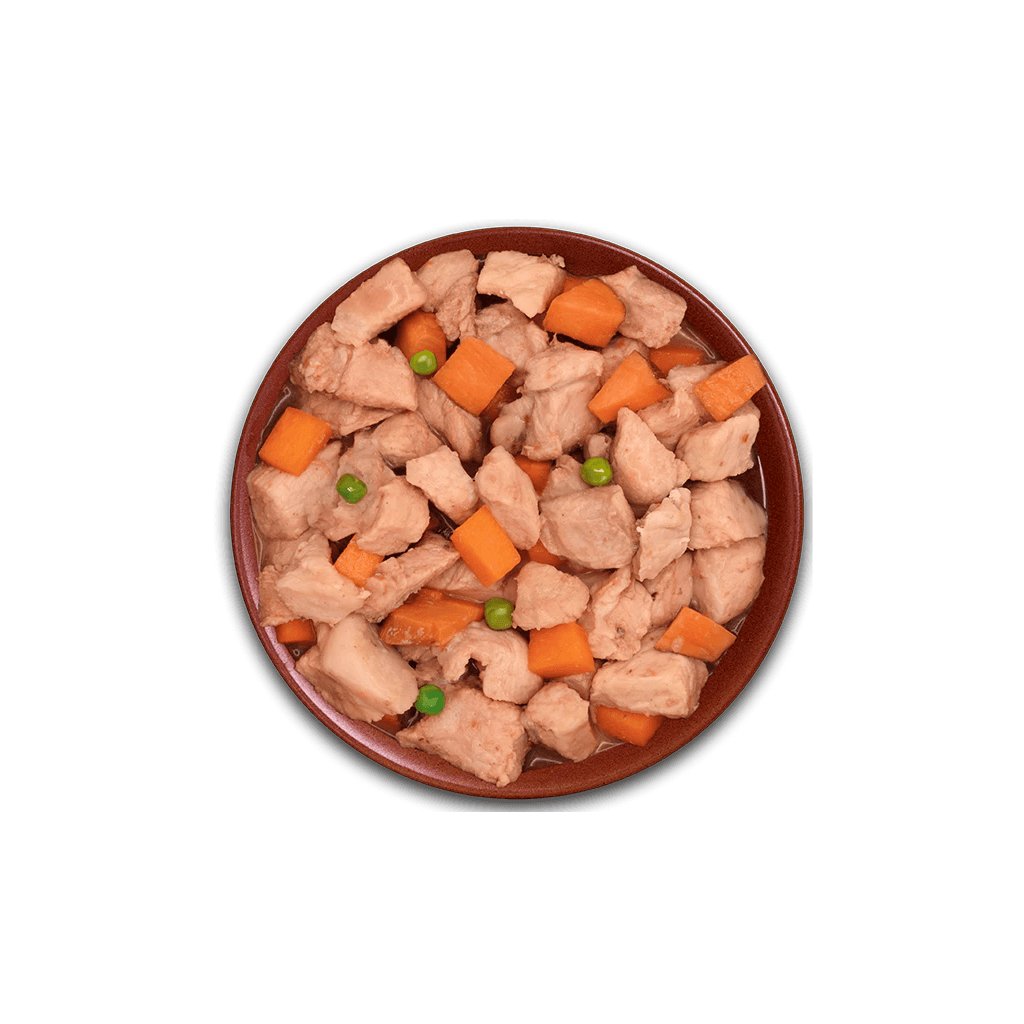 97% čerstvé vepřové maso v omáčce, hrášek, mrkev, sladké brambory, koření.