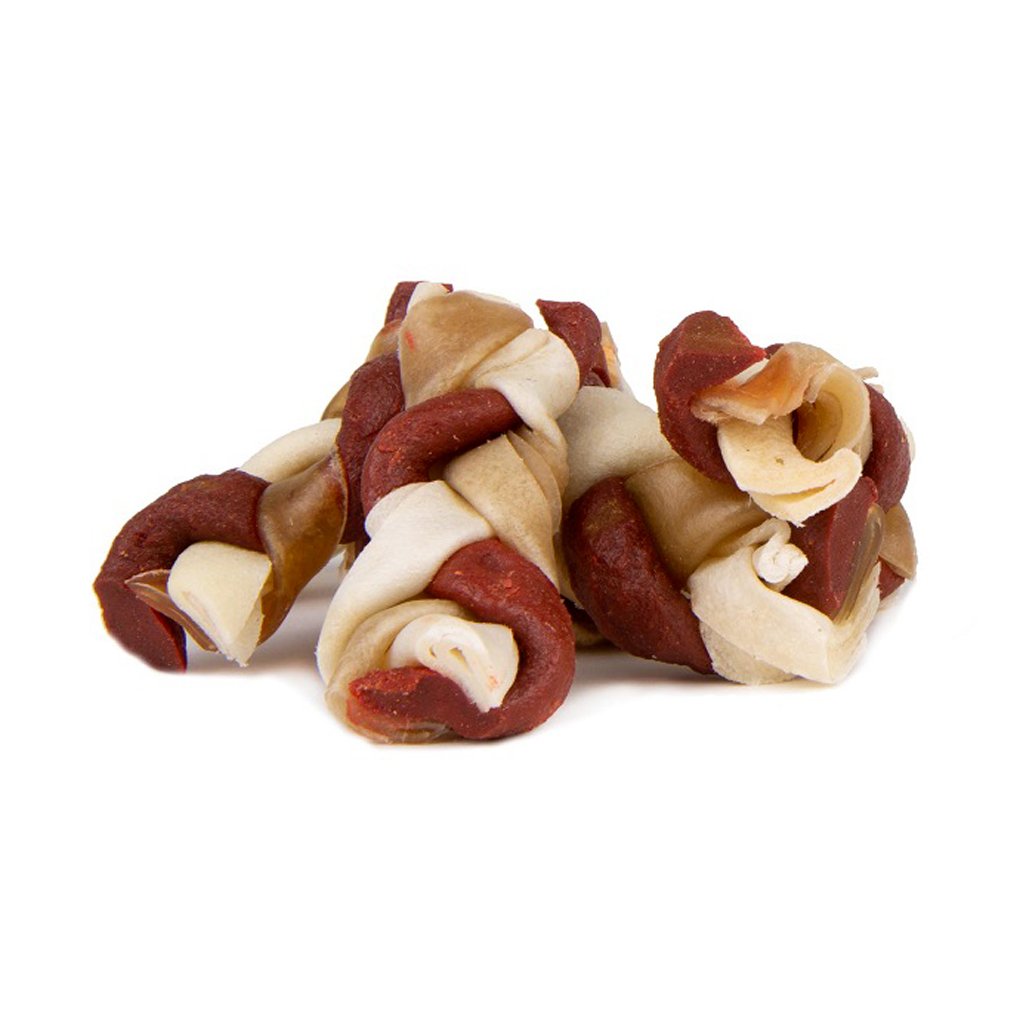 Naducaný copánek o délce 6.5cm spletený ze všeho, co má Váš pes rád - žvýkací bůvolí kůže a lahodné, voňavé, masové jerky (cca 40ks v balení, 540g).